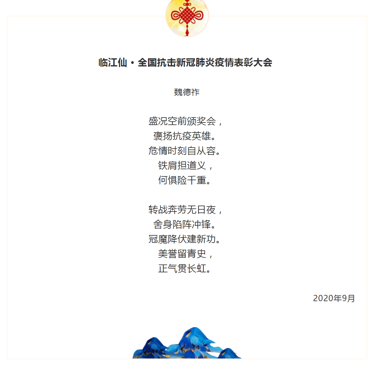 【战“疫”随感】《临江仙 • 全国抗击新冠肺炎疫情表彰大会》