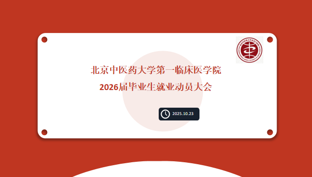 为引导毕业生认清就业形势,提升就业积极性和主动性,抢抓秋季招聘就业关键期,全力推进毕业生高质量充分就业,北京中医药大学第一临床医学院于10月23日在线上线下同时召开2026届毕业生就业动员大会。北京中医药大学招生与就业处副处长徐静、第一临床医学院党委书记刘金民、院长王勇,学院党委副书记、副院长闫占峰、教育处处长刘伟敬、学生科负责人杨芳、全体毕业班辅导员、往届毕业生代表及2026届全体毕业生参会,就业专员吴宛蔚主持会议。